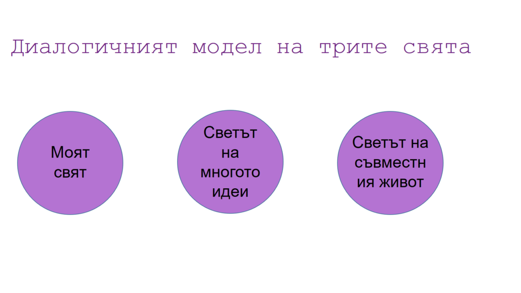 Моделът на диалога с трите свята се използва, за да се покажат три различни начина за водене на диалог. Всеки “свят” представлява различен стил.