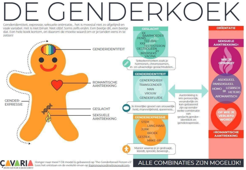 SOGIESC staat voor Sexual Orientation (seksuele oriëntatie), Gender Identity & Expression (gender identiteit en -expressie) en Sex Characteristics (geslachtskenmerken). Kan je je een beeld vormen over waar deze termen voor staan? Een vaak gebruikt beeld om dit verder te duiden is de genderkoek (of gender bread, naar het evenbeeld van ginger bread).