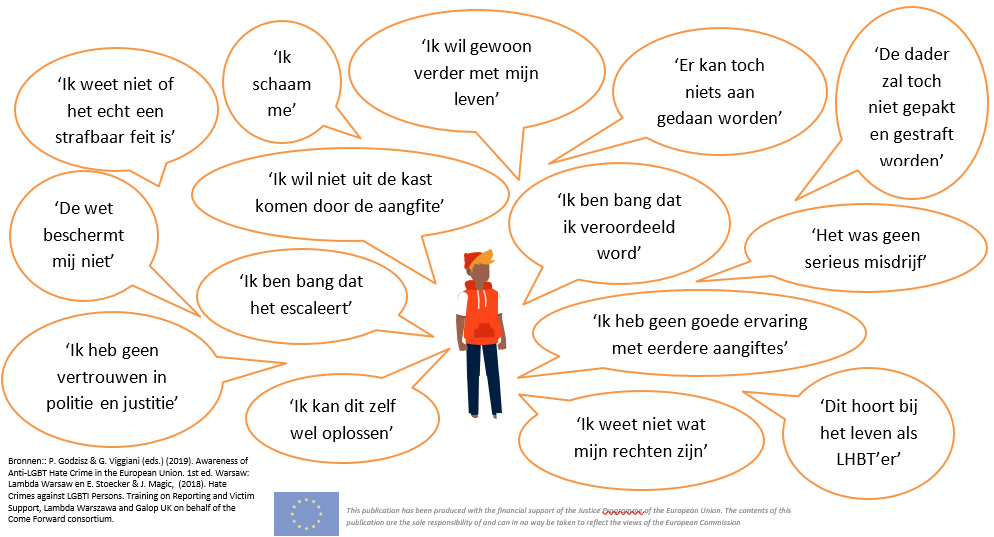 De volgende infographic laat je een overzicht zien van enkele van de meest voorkomende redenen waarom slachtoffers van anti-LHBT haatmisdrijven besluiten geen aangifte te doen.