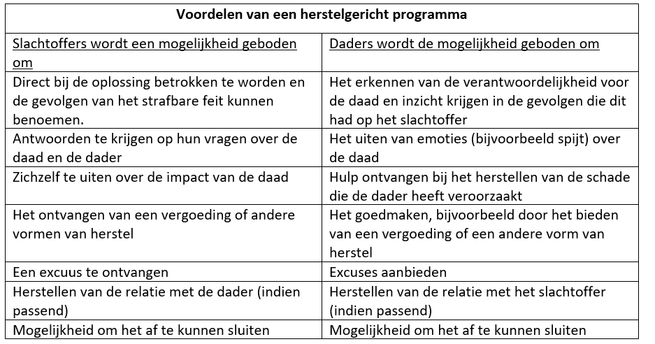 In de onderstaande tabel heeft het UNODC de voordelen voor zowel de dader als het slachtoffer opgesomd die zij kunnen ervaren na het deelnemen aan een herstelgericht programma.