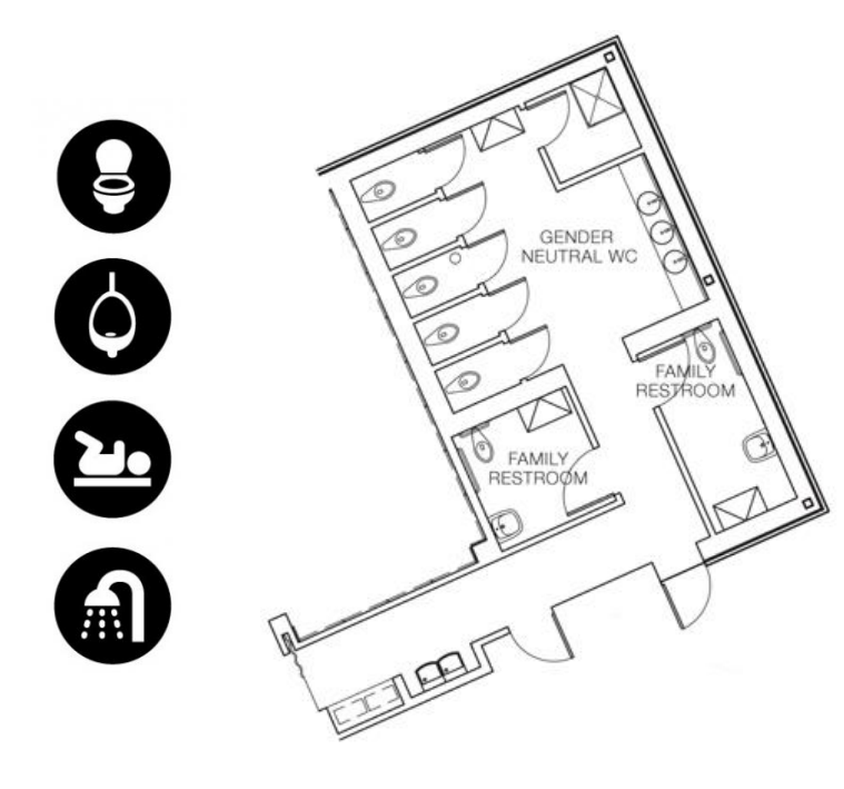 Dit is een voorbeeld van een inclusieve toiletruimte en verschillende inclusieve iconen en indicatoren.