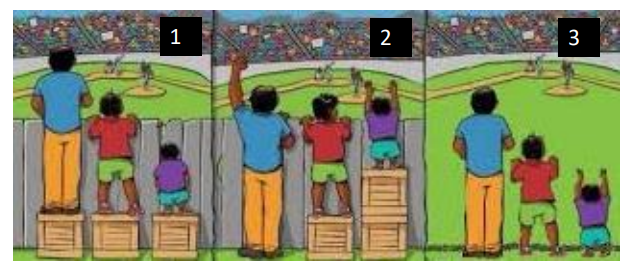 Gelijkheid houdt in dat iedereen hetzelfde krijgt. Dit leidt niet per se tot gelijke uitkomsten: de kleinste toeschouwer heeft geen uitzicht op de wedstrijd, de grootste toeschouwer het meeste uitzicht.